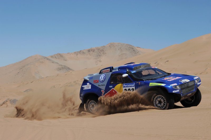 Rallye Dakar 2010, 9. Etappe – Dreifachsieg für VW11.01.2010 Mit einem Dreifachsieg beendet VW die neunte Etappe der diesjährigen Dakar. Gleichzeitig teilen sich die ersten zehn Plätze der Tageswertung vier VW sowie je drei BMW und Mitsubishi. Die ursprünglich 354 Kilometer lange Sonderprüfung der neunten Etappe wurde um mehr als die Hälfte auf nur noch 170 Kilometer verkürzt. Wegen einzelner Nebelbänke konnten die Hubschrauber nicht starten und so hatte der Veranstalter den Start um 3:45 Stunden nach hinten verschieben müssen, und die Streckenlänge entsprechend angepasst. Nasser Al-Attiyah und Timo Gottschalk (Q/D) gelang auf dem Weg von Copiapó nach La Serena in Chile der Tagessieg vor ihren Teamkollegen Carlos Sainz/Lucas Cruz (E/E) sowie Giniel de Villiers/Dirk von Zitzewitz (ZA/D). Mark Miller/Ralph Pitchford (USA/ZA) erzielten in einem weiteren Race Touareg die fünftbeste Zeit hinter den X-Raid-Piloten Guerlain Chicherit/Tina Thörner im BMW. Die Gesamtwertung führt weiterhin Carlos Sainz vor Nasser Al-Attiyah und Mark Miller an. Al-Attiyah verkürzte heute jedoch seinen Rückstand auf den Führenden um sechs auf nur noch 8.36 Minuten.
