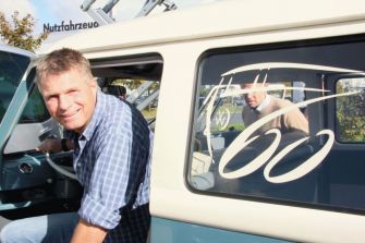 Harald Schomburg am Steuer eines Bullis