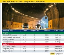 EuroTAP - European Tunnel Awards - Der ADAC kürt die sichersten Tunnel Europas und zieht damit Bilanz aus über 300 Tests in 20 Ländern23.01.2008 Sieg für die Sicherheit: „Markusberg“ in Luxemburg, „Ottsdorf“ in Österreich, „M-12“ in Spanien sowie „Brinje“ in Kroatien sind als beste Straßentunnel Europas der vergangenen drei Jahre mit den European Tunnel Awards ausgezeichnet worden. Die Trophäen wurden von ADAC-Präsident Peter Meyer im Rahmen der EuroTAP Abschlussveranstaltung in der Bayerischen Vertretung in Brüssel den siegreichen Tunnelbetreibern sowie Vertretern aus der Politik der jeweiligen Siegerländer überreicht. Für mehr Sicherheit in den europäischen Straßentunneln hat der ADAC gemeinsam mit elf weiteren Automobilclubs und der Unterstützung der EU-Kommission im Jahr 2005 das Programm EuroTAP (European Tunnel Assessment Programme) ins Leben gerufen. Innerhalb von nur drei Jahren haben Tester mehr als 150 Tunnel überprüft und sind dabei mehr als 125 000 Kilometer durch Europa gereist. Insgesamt wurden seit Beginn der ADAC-Tunneltests im Jahr 1999 bereits 300 Röhren in 20 Ländern gecheckt.