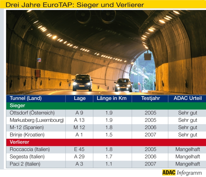 Für mehr Sicherheit in den europäischen Straßentunneln hat der ADAC gemeinsam mit elf weiteren Automobilclubs und der Unterstützung der EU-Kommission im Jahr 2005 das Programm EuroTAP (European Tunnel Assessment Programme) ins Leben gerufen. Innerhalb von nur drei Jahren haben Tester mehr als 150 Tunnel überprüft und sind dabei mehr als 125 000 Kilometer durch Europa gereist. Insgesamt wurden seit Beginn der ADAC-Tunneltests im Jahr 1999 bereits 300 Röhren in 20 Ländern gecheckt.