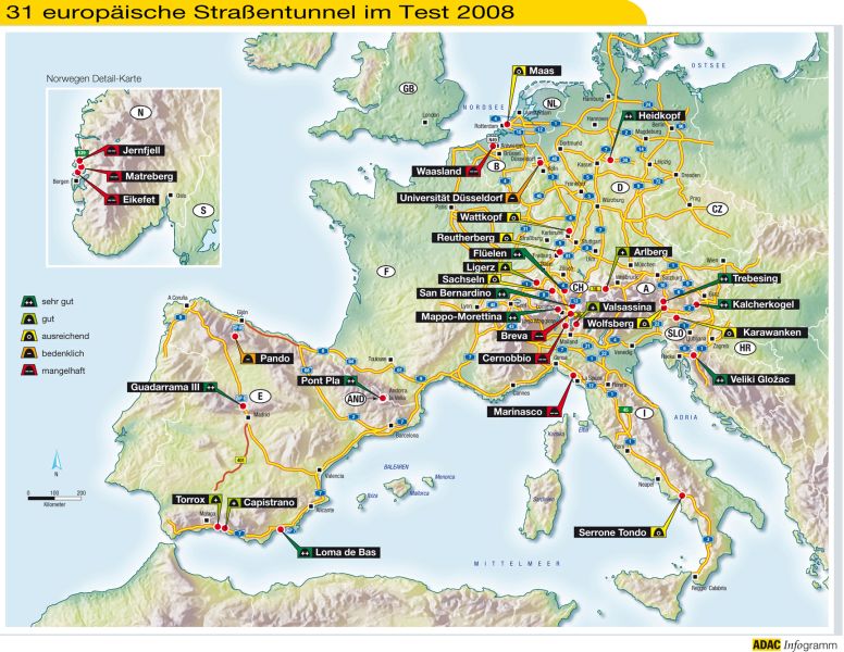 Testverlierer wurde zum vierten Mal in Folge ein italienischer Tunnel. Der 1983 in Betrieb genommene und 2,4 Kilometer lange Cernobbio am Comer See weist erschreckende Missstände auf: keine Tunnelleitzentrale, keine Notrufeinrichtungen, kein automatisches Brandmelde- und Lüftungssystem, nicht gekennzeichnete Fluchtwege und zu wenige Notausgänge.