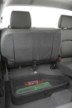 Erst hinter den Vordersitzen hören die Gemeinsamkeiten auf, haben die Innenarchitekten eine eigene Note in den Pickup hineinkomponiert: Die Rücksitzbank ist asymmetrisch geteilt und erfreulich ladeoptimiert variabel. Wie die Beifahrerlehne lassen sich auch deren Lehnen nach vorne klappen, was eine transportfreundliche Fläche ergibt. Liebe zum Detail zeigt sich, wenn man die Sitzkissen der Rückbankelemente nach oben schwenkt und fixiert: Auch dann eröffnen sich speditive Möglichkeiten inklusive herausnehmbaren Ablageschalen für den kleinen Einkauf, der sich mit Netzen abdecken und fixieren lässt.