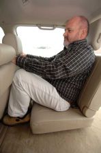 Überdies eingelullt von den Executive-Komfortaccessoires für bequemes Reisen: In der Mittelkonsole ein Kühlfach, gleich daneben der CD-Wechsler. An der Konsolenrückwand ein separates Radioboard für die Passagiere in der zweiten Reihe, die sich auf dem 1,41 m breiten, im Drittelverhältnis klappbaren Lederfauteuil wohler fühlen als ihre Fahrtgenossen in der dritten Reihe: Die müssen sich auf zwei einzelne Notsitze zwängen, die mit 62 cm zwar angenehm breit sind, aber nur 17 cm flach über dem Boden stehen und lediglich 23 cm Kniefreiheit bieten.