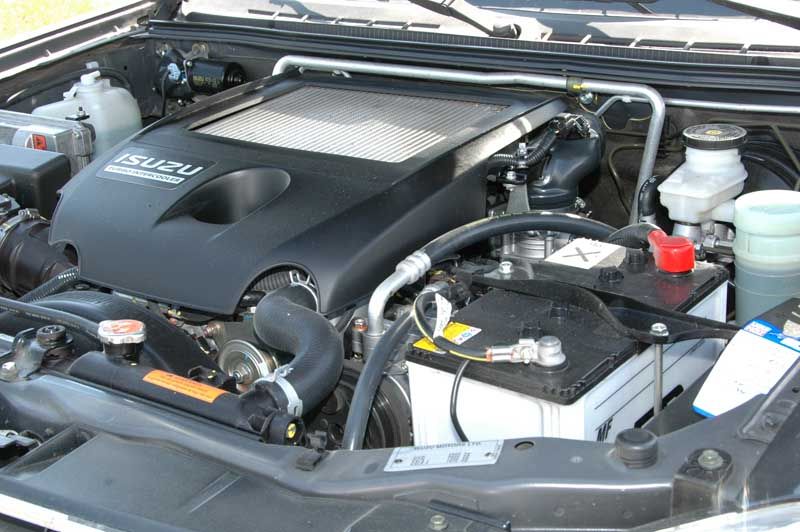 Isuzu D-Max 2.5D – Kernige Kompetenz - Seite 4Moderne Zeiten haben hinter dem markanten gestylten Gesicht mit hochkantigen Scheinwerfern und großem Kühlergrill sowie der charakteristischen Lufthutze auf der Motorhaube Einzug gehalten: Hier arbeitet ein kernig tönender Vierzylinder-Turbodiesel mit Common-Rail-Direkteinspritzung, zwei obenliegenden Nockenwellen und vier Ventilen pro Brennraum. Das 2,5-Liter Triebwerk stampft bereits ab Leerlaufdrehzahl kräftig los und zieht, wenn man es flugs und ohne Verhaspeln durch das lasterhaft langwegige Fünfgang-Menü der Schaltkulisse schafft, ohne Turboloch durch. Um die Ohren mit einer angenehmen Akustik zu verwöhnen und das optimale Kraftpotenzial des Aggregats stets zu nutzen, richtet sich der D-Max'ler kommod zwischen 2.000 und 3.000 Umdrehungen ein – stehen ihm hier doch auch die 280 Newtonmeter Maximaldrehmoment jederzeit zur Verfügung. Schaltfaule freut's, für den Zwischenspurt reicht in der Regel ein beherzter Tritt aufs Gaspedal. Das breite Drehzahlband bietet zudem ideale Voraussetzungen für ein starkes Fortkommen im Gelände. Der Allradantrieb wird elektrohydraulisch über eine Drucktaste im Armaturenbrett zugeschaltet, damit's bei der 4x4-Aktivierung bis 100 km/h nicht peinlich und schadenimmanent im vorderen Antriebsstrang kracht, wird selbiger durch eine Synchronisation im Verteilergetriebe entsprechend hochbeschleunigt. Eine zweite Taste aktiviert die Untersetzung. Beide Getriebe sind erfreulich geländeorientiert ausgelegt, sprich: Die Zahnradpaarungen der fünf Gänge weit verspreizt und das Reduktion kurz übersetzt. Dazu gesellen sich eben noch die Beweglichkeit der starren Hinterachse, eine ordentliche Bodenfreiheit von 25 cm vorne und 21,5 cm hinten sowie große Böschungswinkel (s. Tabelle).