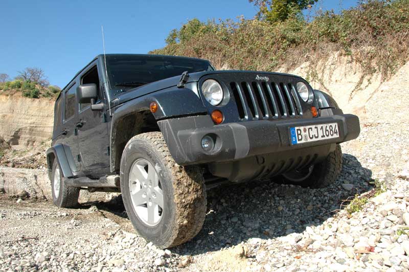 Jeep Wrangler 3.8 Automatik Unlimited Sahara – Bergziege für fünf Alpinisten - Seite 3Entsprechend souverän meistert der Unlimited Geländeausflüge jeder Art. Mit seiner Bodenfreiheit von einem Viertelmeter und entsprechend guten Böschungs- sowie Rampenwinkeln nimmt er auch grobe Geländeverwerfungen ohne aufzusetzen, und die beiden Starrachsen halten immer noch Bodenkontakt – ungeteilte Achsen verschränken nun mal besser als die meisten Einzelradaufhängungen, selbst wenn diese noch so aufwändig konstruiert sind. Mit 199 PS (146 kW), einer vernünftig kurzen Geländereduktion (2,72:1) und der Drehmomentverstärkung im Wandler des Automatikgetriebes scheut der Wrangler keinen Anstieg. Beim langsamen Rollen im Standgas genügt ein kleiner Impuls vom Gaspedal und der Wrangler stellt verzögerungsfrei Leistung im Überfluss bereit. So macht das Kraxeln und Klettern einfach nur Spaß! Und selbst ein Stopp mitten in der Steigung verursacht keine Schweißperlen auf der Stirn des Fahrers: Die Berganfahrhilfe „BAS“ hält den Wrangler sicher am Hang, und ein einfacher Tritt aufs Gaspedal genügt, um die Fahrt wieder fortzusetzen – sofern die Traktion dann noch ausreicht, ansonsten hilft die Traktionskontrolle per Bremseneingriff relativ effizient weiter.