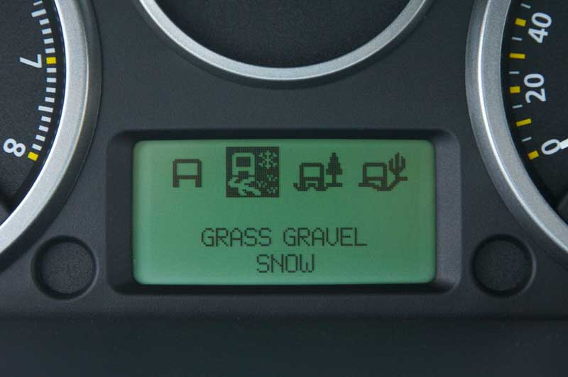 Die jeweiligen Programmstufen des „Terrain Response"-System werden über einen Drehknopf auf der Mittelkonsole angewählt: Die relativ klaren Symbole stehen für die Modi „normaler Straßeneinsatz" (taugt auch für leichtes Gelände), „Gras und Schnee" (was für prinzipiell traktionsmindernden, rutschigen Untergrund auf und abseits der Straße steht), „Sand" und „Schlamm". Das angesteuerte Wunschprogramm beeinflusst das Drehzahlverhalten des Motors, die Schaltcharakteristik des Automatikgetriebes, die elektronische Regelung der Kraftverteilung über die Haldex-Kupplung sowie die Reaktion aller anderen elektronischen Zutaten wie ABS, DSC (die Stabilitätskontrolle) oder ETC (die Traktionskontrolle).