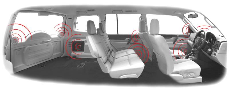 Der neue Mitsubishi Pajero - wertvoller und schwerer - Seite 4Komplette Kontrolle über Drehzahl-, Geschwindigkeit und Verbrauch bekommt der Fahrer auf den Anzeigen im neu gestalteten modernen Instrumententräger. Weitestgehend unverändert ist dabei das bewährte, elektronisch gesteuerte Allradsystem "Super Select 4-II 4WD" mit Geländeuntersetzung und serienmäßiger Traktions- und Fahrstabilitätsregelung sowie zuschaltbarer 100 % Differenzialsperre hinten. Neu hinzu gekommen ist jedoch, je nach Ausstattungsvariante, eine hochwertige, High-End-Technikausstattung mit 30-Gigabyte-Festplatte für Navigation und Musik-Server, eine Rückfahr-Kamera, 860-Watt -Audioanlage von "Rockford A-coustic Design" mit zwölf Lautsprechern - also Disco pur und selbst vom kernigen Diesel-Motor hört man nichts mehr, wenn man aufdreht. Video 519 KB