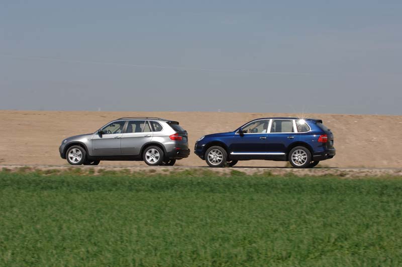 In aller Frische treten zwei muskulöse Schwergewichtler der SUV-Klasse mit kräftigen Achtzylinder-Herzen gegeneinander an: mit 4,8-Liter Hubraum und über 350 PS müssen sie über 2,2 Tonnen bewegen. Von der reinen Papierform her hat der Porsche die besseren Karten: Er ist leichter und stärker und wartet überdies mit einer Geländeuntersetzung für das auch manuell schaltbare Automatikgetriebe auf.