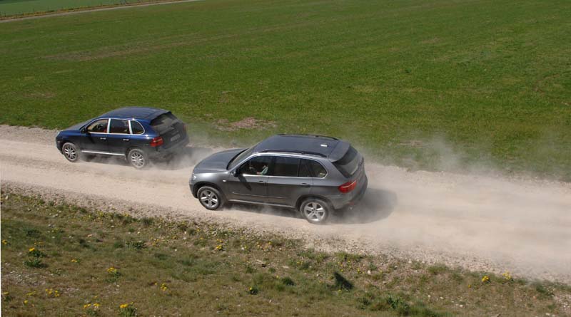 Vergleich BMW X5 4.8i mit Porsche Cayenne S - Hab Acht.... - Seite 6Doch so gänzlich talentlos gibt sich der BMW nicht geschlagen: Immerhin setzt er im Geländegefälle mit einer Bergabfahrhilfe (HDC = Hill Descent Control) gegen die Untersetzung des Porsche. Oder versucht es zumindest: Der X5 ist stets als erster unten, was dem Frontspoiler trotz ordentlichen 25° Böschungswinkel nicht immer gut bekommen mag. Doch werden echte Geländeausflüge ohnehin die Ausnahme bleiben: Sowohl der BMW X5 4,8i als auch der Porsche Cayenne S werden von ihren regulären Besitzern eher als Asphaltburner und komfortable Reiselimousinen eingesetzt, deren Allradantrieb sie vor allem als Fahrsicherheitsfaktor und im Winter als Traktionstalent einsetzen. Die Langstrecken-Disziplin meistern beide sourverän: Dank bequemen, elektrisch vielfach einstellbaren Sitzen vorne und ausreichend Bein- und Kopffreiheit hinten. Dank kommoden Fahrwerksabstimmungen, die man je nach Lust und Budget um Luftfederungen bereichern kann. Dank akustisch angenehmen Vau-Acht-Motoren, die Freude durch Kraft spendieren. Und dank eines Verbrauchs, der öfter mal zur kurzen Pause einlädt: Viel mehr als knapp über 400 Kilometer sind mit einer Tankfüllung eher selten drin... Ach(t), was soll's. Sie klingen einfach zu schön.