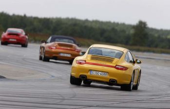 Porsche Carrera 4 / 4S – Ein Biss(-chen) mehr05.08.2008 Der bisherige Porsche Carrera 4 war mit 325 bzw. 355 PS nicht gerade untermotorisiert und ließ sich damit dank einem effizienten Allradsystem sowie einer präzise-schnellen Tiptronic vehement treiben. Besser geht's nicht, so dachten die Besitzer. Jetzt hat Porsche bei der neuen Generation des Carrera 4 ein paar Schäufelchen zugelegt: Mehr Biss dank 20 bzw. 30 zusätzlicher Pferdestärken, der brandneuen PDK-Doppelkupplung und vor allem eines grundlegend neuen, ziemlich gut funktionierenden elektronischen Allradantriebs. Mit einem breiten Lächeln auf den Lippen bewegen wir uns über einen kleinen Rundkurs im Outback von Berlin. Wir sitzen im neuen Porsche Carrera 4S. Der Kurs ist recht kompakt, nur etwa 2,4 Kilometer lang. Die Geraden sind entsprechend kurz, das Kurvengeläuf eng und flüssig und es gibt etliche Curbs zum „Räubern“. Wir fliegen auf der Geraden dahin, vierter Gang moderat, der Sechszylinder im Heck singt die typische Boxer-Melodie. Dann die Linkskurve, nicht einsehbar, der Scheitelpunkt weit innen. Ein beherzter Tritt auf die Bremse, der Vorderwagen nickt leicht ein, per Drucktasten auf dem Lenkrad mit Zwischengas („bam, bam“ erledigt die Elektronik) in den zweiten Gang zurückschalten, spät einlenken und dann – push the pedal to the metal – aufs Gas steigen.