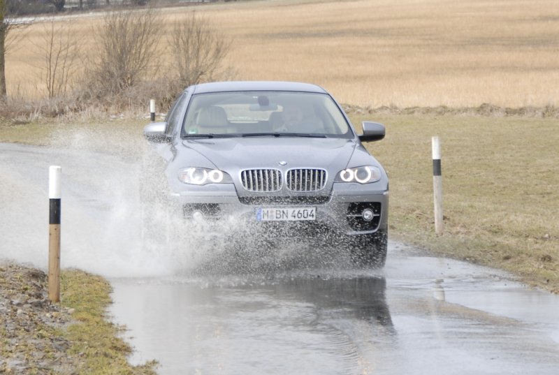 BMW X6 xDrive 35d – Familien-Coupé und High-Tech Showcar / Seite 4Also versuch ich's von der anderen Seite: Ein Coupé muss ja in erster Linie gar nicht unbedingt praktisch sein, sondern Spaß machen! Und bei dem Gewicht und der Größe – kann da so was wie Fahrspaß überhaupt aufkommen? Unter der Haube des Testwagens mit der Typbezeichnung X6 xDrive 35d ist der stärkere der beiden lieferbaren Diesel montiert: Drei Liter Hubraum von zwei Turbos künstlich beatmet, macht 286 PS (210 kW) bei 4.400 Touren und 580 Newtonmeter zwischen 1.750 und 2.250 U/min. Oder in Fahrleistungwerten gesagt: In sieben Sekunden beschleunigt der Sechszylinder den X6 auf Tempo hundert und lässt ihn in der Spitze knapp 240 Stundenkilometer schnell rennen. Die Kraftübertragung erfolgt serienmäßig per Sechs-Stufen-Automatik mit manueller Schaltmöglichkeit. Die elektronische Abstimmung der Automatik lässt den drehmomentstarken Diesel im Bummelbetrieb mit niedrigen Drehzahlen dahinbrummeln, reagiert aber spontan auf jeden Gasstoß. Das Ergebnis: man fühlt sich jederzeit üppig motorisiert, ohne dass Reue an der Tankstelle aufkommt: Im Testdurchschnitt genehmigte sich der X6 35d Familienbudget-freundliche 10,6 Liter Diesel, das ist ein Wort. Die Drehmomentverteilung auf die vier Räder erfolgt im X6 über den elektronisch geregelten xDrive Allradantrieb, der aus dem X5 wohlbekannt ist. Dennoch hat BMW das Allradsystem im X6 um eine Komponente erweitert: Die „Dynamic Performance Control“ (DPC). Während der xDrive die Antriebskräfte zwischen Vorder- und Hinterachse verteilt, übernimmt die Dynamic Performance Control die gleiche Aufgabe zwischen den beiden Hinterrädern. Sie versorgt also das Rad mit der besseren Bodenhaftung mit mehr Drehmoment, was einerseits das Handling und die Stabilität in schnell gefahrenen Kurven verbessert, andererseits die Traktion auf unterschiedlich griffigem Untergrund erhöht.