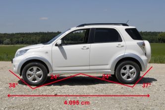 Terios Top S (22.990 Euro): zusätzlich Kotflügelverbreiterungen und 235/60 R 16 Bereifung; Automatikgetriebe 1.380,-; Perleffektlackierung 410,- |