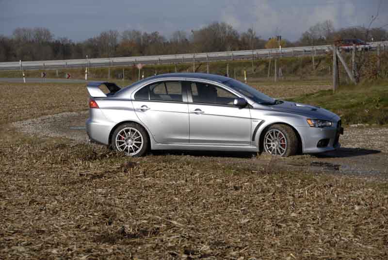 Mitsubishi Lancer Evo – Lass die Gerade Kurve sein! - Seite 5Das System arbeitet so präzise und schnell, dass sich der Evo nur durch gröbste Lastwechselprovokation auf schotterigem Untergrund zum Drift überreden lässt. Dank der sportlichen Sitzposition in den serienmäßigen Recaro-Möbeln mit überzeugendem Seitenhalt und passender Lenkradhaltung hat man ihn dabei aber jederzeit kontrolliert im Griff. Ein sensibles Popometer und eine Portion Fahrtalent vorausgesetzt... Auf trockenem Asphalt rutscht dieses Rallye-Basismodell im Extremfall mit leichtem Powerslide über alle Viere Richtung Kurvenausgang. Im Normaltempo – das wir im Alltagsverkehr jedem ans Herz legen – zieht der Mitsubishi seine Spur wie auf Schienen. Wer moderat unterwegs ist, darf sich dennoch der Aufmerksamkeit seiner Umwelt „erfreuen“: Mit der aggressiven Spoileroptik – Schaufel vorne, „Biertheke“ hinten und Diffusor am Heck – zieht die zehnte Evolutionsstufe des Mitsubishi Lancer die Blicke der Passanten auf sich. Ob man will oder nicht: Da fühlt sich auch Otto Normalfahrer fast wie ein prominenter Rallyefahrer. Klappe.