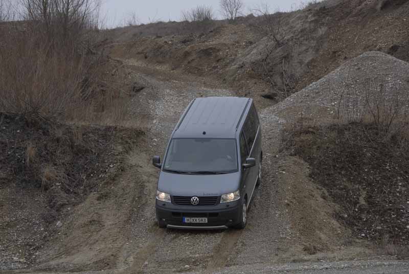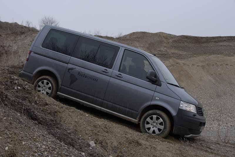 Trainingsparcours Kiesgrube, Session Auf- und Abfahrt mit Schotter und Matsch: Manuelle Differenzialsperre hinten aktiviert, den kürzer übersetzten 1. Gang eingelegt (der ist Bestandteil des von 4x4-Spezialist Peter Seikel installierten Geländepakets) – mit der souveränen Lässigkeit von 400 Newtonmeter, die ab 2.000 Umdrehungen an der Kurbelwelle packen, wühlt sich der über 2,4 Tonnen schwere PanAmericana durch den Dreck, klettert und kraxelt. Gefühl in Gas- und Kupplungsfuß erfordert das Triebwerk lediglich beim Anfahren: Trotz des 3,92:1 untersetzten ersten Gangs will die Anfahrschwäche des 2,5-Liter Turbodiesel mit der mittlerweile in die Jahre gekommenen Pumpe-Düse-Direkteinspritzung sensibel austariert werden. Sonst macht's „Grrrumm“, einen kleinen Hopser und der Motor schweigt. Was hin und wieder selbst ausgewiesenen T5-Kennern passiert...
