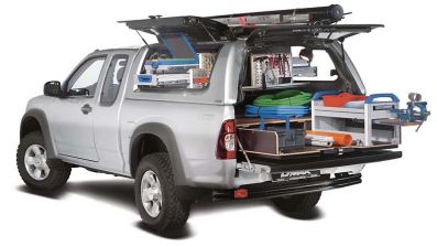 Apropos Mechaniker-Equipment: Einen großen Teil des entsprechenden Hand- und Elektrowerkzeugs hatten wir in dem Arrangement aus Schubladen und Staufächern eingeräumt, die in der kleinen Werkstatt-Einrichtung unter dem Hardtop installiert war. Das vom Spezialisten Road Ranger gefertigte Kunststoff-Dach auf der D-Max-Ladefläche ist praktisch die Basisschale für das „Handwerker“-Paket, das man sich aus dem Isuzu-Zubehörprospekt zusammenstellen kann. Das Hardtop RH2 Profi II verfügt neben dem klassischen Heckfenster oberhalb der Laderaumklappe noch über je eine fensterlose Seitenklappe links und rechts, mittels der man an die Regal- bzw. Schubladenelemente herankommt. Isuzu Deutschland arbeitet mit dem Fertigungsbetrieb und Ausrüstungs-Experten aus Oberding bei München übrigens seit Jahren eng in Sachen funktionalem Zubehör zusammen.
