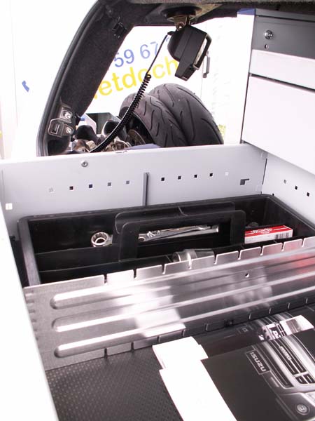 Nicht nur Rennmechaniker werden sich über die in unserem testbeispielhaften Handwerker-Paket auf der Ladefläche installierte, auf Schienen ausziehbare große Aluwanne freuen, die einen robusten Holzboden trägt. Auf diesem, mit immerhin 250 Kilo belastbaren Schubboden lassen sich unterschiedliche Träger und Regalsysteme verschrauben. Wie beispielsweise auch ein Werkbankschub, der sich unproblematisch für die schnelle Reparatur handhaben lässt: Rausziehen, mobilen Schraubstock in eine Führungsschiene einstecken und fixieren – schon kann's losgehen. Das nötige Werkzeug ist dank der Staufächer ordentlich in greifbarer Nähe gelagert. Die Regale lassen sich individuell zusammenstellen und einbauen. Als nicht nur in diesem Zusammenhang praktisches Zusatzfeature empfiehlt sich die als Zubehör erhältliche 50 Watt-Arbeitslampe mit Magnetfuß.