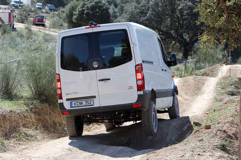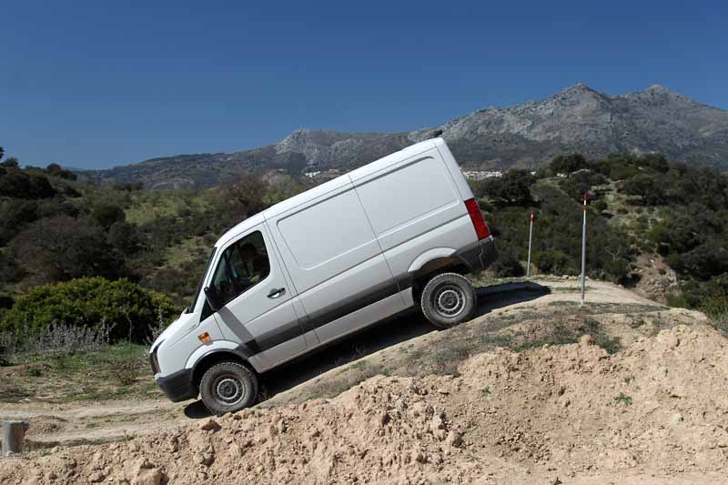 Fahrbericht: VW Crafter 35 Kastenwagen 2,0-l-BiTDI 4motion – Speditionsreise ins Gelände / Seite 2Aber aufpassen: Hat man den Motor einmal abgewürgt, sind alle Differenziale wieder entsperrt und es ist ein erneuter Druck auf die Aktivierungstasten fällig. So, nun sind wir sind aber noch nicht fertig mit dem Achleitner-Umbau, der im Crafter 4motion steckt: Der umfasst nämlich noch verstärkte Federn und härtere Dämpfer mit progressiver Kennung sowie stärkere Stabilisatoren für die vordere Einzelradaufhängung sowie die hintere Starrachse. Außerdem eine Höherlegung um 100 mm gegenüber der Serie, womit wir bei 30 cm Bodenfreiheit und eine Wattiefe von 600 mm sind. Die weiteren Eckdaten zur Komplettierung: 25° Rampenwinkel und 28° Grad Böschungswinkel hinten beim kurzen Radstand-Modell. Viel Aufwand? Aber irgendwo müssen die 19.950 Euro ja herkommen. Das ist die Aufpreis-Summe, die VW für den Achleitner-Allrad abruft. Ja, die Mehrwertsteuer kommt noch dazu. Wer sich nun, sagen wir mal, für den kurzen Kastenwagen mit Normaldach entscheidet, sollte also 62.344,10 Euro vom Guthaben auf seinem Konto abziehen (diesmal inklusive Mehrwertsteuer gerechnet). Bei diesem Preis kommt so ein Crafter 4motion natürlich als reines Nutzfahrzeug daher, sprich: ausstattungsmäßig so nackt wie ein Playmate des Monats auf dem Poster im Fahrerhaus. Um den Crafter zumindest mit den nötigsten Technik- und Komfortfeatures zu konfigurieren, gilt es eine im wahrsten Wortsinn vielseitige Ausstattungsliste durchzuarbeiten, in der unter anderem so essenzielle Dinge wie ein „Mantelhaken für die B-Säule“ zum Preis von 5,95 Euro aufgeführt sind. Das Vorbereitungspaket für den Achleitner-Allradantrieb wird hier übrigens mit 1.106,70 Euro veranschlagt, wobei man aus konstruktiven Gründen auf zusätzliche Seiten- und Kopfairbags verzichten muss. Kurz gesagt: Um sich die Ausstattung Ihres Crafter 4motion zusammenzustellen, sollten Sie mindestens eine Stunde einkalkulieren. Und ein Zusatzpolster auf dem Konto.