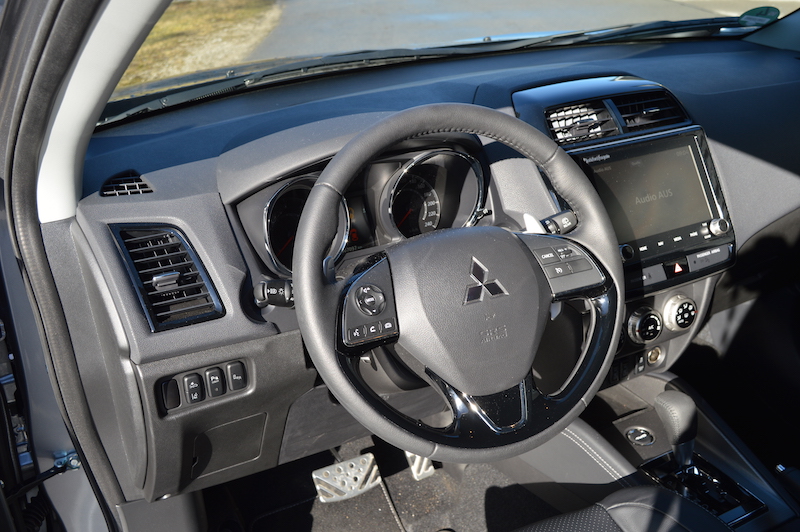 Mitsubishi ASX 2.0 4WD CVT – Allrad-Cruiser mit Ahnen-Kanten31.03.2020 Dynamic Shield. So hat Mitsubishi das frische Design seiner aktuellen Modellgenerationen getauft. Ein etwas kantig geratener Stil, der für unseren Probanden ASX 2.0 4WD CVT zumindest optisch die Gene seiner Mitsubishi-Geländewagen-Ahnen beschwören soll. Was sind seine wahren Talente? Über Geschmack lässt sich bekanntlich streiten. Weil jeder nun mal seinen eigenen hat. Und den darf er auch kundtun. Da stehen also nun zwei Allrad-Magazinler vor dem dynamic-geshieldeten Mitsubishi ASX, Generation 2020, und begutachten zunächst einmal dessen bullige Front. „Schlitzige Scheinwerferaugen über hochkantigen Nebellampen?“ Das wirkt für den einen „vollkommen disharmonisch“, für den anderen „provokativ maskulin“. Das Betrachtungsspielchen wiederholt sich am Heck: Auch hier sorgt der Kontrast von weich-gerundeten Rückleuchten über hart-gekanteten Stoßfängerecken für einen Disput in Sachen subjektiver Ästhetik. Letztendlich werden wir uns nur darüber einig, das der neue ASX zumindest optisch wieder einen Hauch mehr nach Geländewagen ausschaut als sein Vorgänger. Von dem er – aus Entwicklungs-Kostengründen – die Plattform sowie den Karosseriekern übernommen hat. In dessen Innerstem haben die Mitsubishi-Designer dann aber für die neue Generation ebenfalls Hand angelegt. Zu den Modernisierungsmaßnahmen zählen hier ein achtzölliger Touchscreen in der Mittelkonsole für das bei unserem Testwagen geschnürte Plus-Paket. Das Display ist eine feine übersichtliche Sache zur aktiven Nutzung aller informativen und medialen Funktionen – wie beispielsweise der ordentlichen Navigation und der Apple CarPlay-/Android Auto-Connection zur musikalischen Untermalung der Fahrt oder dem sicheren handfreien Telefonieren. Das Menü lässt sich entspannt über die Tasten am Multifunktionslenkrad (ebenfalls ein Plus-Feature) steuern.