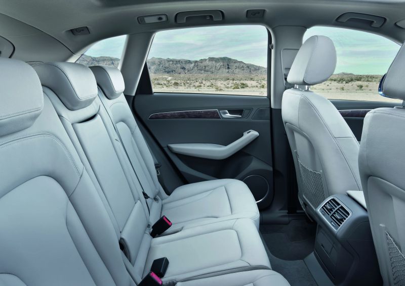 Der lange Radstand von 2,81 Metern sorgt für großzügige Platzverhältnisse an Bord des Audi Q5. Fünf Personen kommen bequem unter, die Lehnen der Fondsitze lassen sich in der Neigung verstellen und besonders einfach umklappen: Wenn man die Hebel der Fernentriegelung im Kofferraum betätigt, klappen sie selbstständig nach vorne. Der Gepäckraum wächst dann von 540 auf 1.560 Liter Volumen, unter seinem Ladeboden verbirgt sich ein zweiter Stauraum.