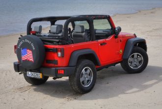 Offroad-Scheinwerfer vor der Frontscheibe und eine Reserveradabdeckung mit US-Flagge und dem Schriftzug There's only one (Es gibt nur den einen) unterstreichen den Abenteurer-Look des Jeep Wrangler Golden Eagle.
