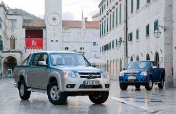 Mazda BT-50: Aufgehübscht und aufgefrischt15.10.2008 Mit einer umfassenden Modellpflege schickt Mazda seinen Pickup BT-50 ins neue Modelljahr 2009: Der beliebte Nutz- und Lifestyler-Laster präsentiert sich stilistisch modernisiert und mit einer frischen Innenausstattung sowie neuen Komfortfeatures. Technisch dagegen bleibt er unverändert. Der Mazda BT-50 des Jahrgangs 2009 ist auf den ersten Blick zu erkennen: Vorne am neuen Design der Kühlermaske im Stil eines kursiven „H“ sowie den nun silberfarbenen Scheinwerfereinfassungen, hinten an modifizierten Heckleuchten sowie einem in Wagenfarbe lackierten Ladeklappengriff. Außerdem sind die Stoßstangen an Front und Heck passend zu den jeweiligen Metallic-Farben der Karosserie lackiert, bei denen der Kunde nun die Auswahl zwischen elf Eintonfarben und drei Zwei-Farb-Kombinationen hat. Die Abdeckungen der Trittleisten glänzen nun in Silber-Metallic und das Glas der hinteren Seitenfenster sowie der Heckscheibe sind in der Toplands-Ausstattung des Modelljahrgangs 2009 dunkel getönt. Im Innenraum des BT-50 Pickup will Mazda mit einer „limousinenartigen Atmosphäre“ überzeugen und hat dazu neue Stoffe, Farben und Beleuchtungen kreiert: Die Instrumente im Cockpit erstrahlen bernsteinfarben, die Sitze in einem dunkelgrau schimmernden, strukturierten Gewebe. Und die Mittelkonsole soll mit ihrer Silberoptik für einen gesteigerten Qualitätseindruck sorgen. |