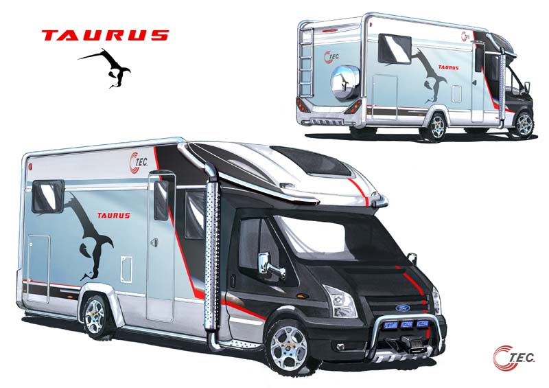 T.E.C Taurus 4x4 Reisemobil – Reichlich Chrom, ein wenig Cross06.08.2008 Auf dem Caravansalon Düsseldorf (Start: 29. August) wird Reisemobilspezialist T.E.C. aus Sassenberg das erste Allrad-Reisemobil auf Ford-Transit-Chassis vorstellen: Eine gemeinsam mit Ford entwickelte Studie, die auf den Namen „Cross-TEC“ hört. Das neue Wohnmobil, unter dem Arbeitstitel „Taurus 4x4“ konzipiert, basiert auf dem konventionellen Teilintergrierten FreeTEC 708 Ti, kommt also mit dessen Grundriss (Halbdinette vorne, Küchenzeile und Bad mittig, Bett im Heck). Ungeachtet des langen Hecküberhangs soll das 7,36 Meter lange Mobil durchaus mit Geländetalenten überzeugen. Für mehr als Schlechtwege-Ausflüge wird es aufgrund der unzureichenden Böschungswinkel und trotz höhergelegter luftgefederter Hinterachse vergleichsweise geringen Bodenfreiheit aber kaum reichen.