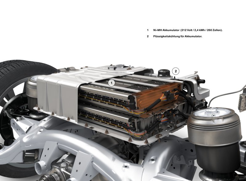 Ihre Energie beziehen die Elektromotoren aus einer NiMH-Hochleistungsbatterie, die unterhalb des Gepäckraumbodens positioniert ist und auch das Bordnetz des Fahrzeugs mit Strom versorgt. Beim Bremsen beziehungsweise Gaswegnehmen wird Bewegungsenergie in elektrische Energie umgewandelt und in der Hochleistungsbatterie gespeichert. Zu diesem Zweck übernehmen je nach Fahrsituation entweder einer oder beide Elektromotoren die Funktion eines Generators, um verbrauchsneutral erzeugten Strom in den Hochvolt-Speicher zu speisen. Die anschließende Nutzung dieser Energie für den Antrieb bewirkt die Reduzierung des Kraftstoffverbrauchs.