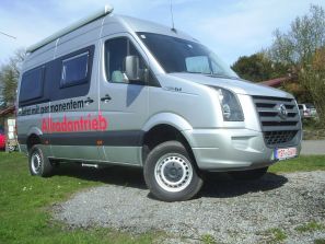 Behl Mobile – Komfortabler Campingbus auf VW Crafter 4x403.11.2010 Multifunktional ausgebaute Campingbusse auf der Basis von Kastenwagen sind die Spezialität von Erhard Behl aus Marktheidenfeld. Ein charakteristisches Vorzeigeobjekt des fränkischen Familienbetriebes in Sachen Individualmobile ist ein Kundenfahrzeug auf der Basis eines VW Crafter mit permanentem Allradantrieb des österreichischen 4x4-Spezialisten Achleitner. Der als Fensterbus angelieferte VW wurde in der Spezialwerkstatt zunächst komplett entkernt, die hinteren Glasflächen wurden durch Karosseriebleche ersetzt und die Wände des künftigen Wohnraums aufwändig isoliert. Zusätzlich kommt an heißen Tagen eine Klimaanlage, an kalten eine gasbetriebene Truma C4 Combiheizung zum Einsatz. Der 60 Liter große Frischwassertank ist frostsicher und versorgt Nasszelle und Spüle via einer Druckpumpe über ein in Fahrzeugboden und -wänden verstecktes Schlauchsystem. Der Abwassertank fasst 30 Liter. Wert auf solide Qualität legt Erhard Behl auch beim Möbelbau mit Apfelbaum-Dekor: Den Grundriss des Crafter 4x4 hat er nach den Vorgaben des Kunden gestaltet. Charakteristische Elemente sind eine Halbdinette mit Einzelsitz (inkl. 3-Punktgurt) und drehbaren Fahrerhaus-Sitzen, eine funktionale Küchenzeile inklusive Zweiflamm-Gaskocher, integrierter Spüle (beides mit Glasabdeckung), Besteckschublade, Gewürzregal, einer klappbaren Arbeitsfläche sowie einem 50 Liter fassenden Kompressorkühlschrank, eine komplett eingerichtete Nasszelle und ein knapp 2,00 x 1,40 Meter großes Querbett im Heck. Eine 85 Ah starke Bordbatterie gewährleistet die autarke Stromversorgung der drei 230 Volt-Steckdosen sowie der Beleuchtung.