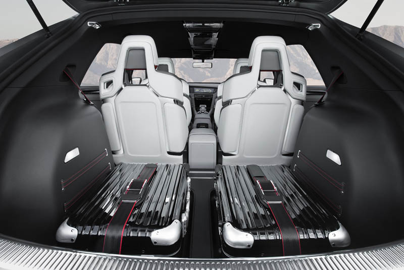 Die Studie ist mit 4 Einzelsitzen ausgestattet, die alle als Schalen mit einer fest integrierten Kopfstütze konzipiert wurden. Die Rücksitzlehnen und die Lehne des Beifahrersitzes können komplett nach vorn geklappt werden. Hilfreich dabei: Die Rückenlehnen sind außen mit Kunststoffschalen verkleidet; umgeklappt entsteht so eine widerstandsfähige Ladefläche. Der Kofferraum hinter den Rücksitzen fasst ein Volumen von 380 Litern (bis Höhe Fensterkante). Wird der 1.724 mm lange Innenraum bis zu den Lehnen der Vordersitze und dachhoch beladen, steigt das Volumen auf 1.230 Liter.