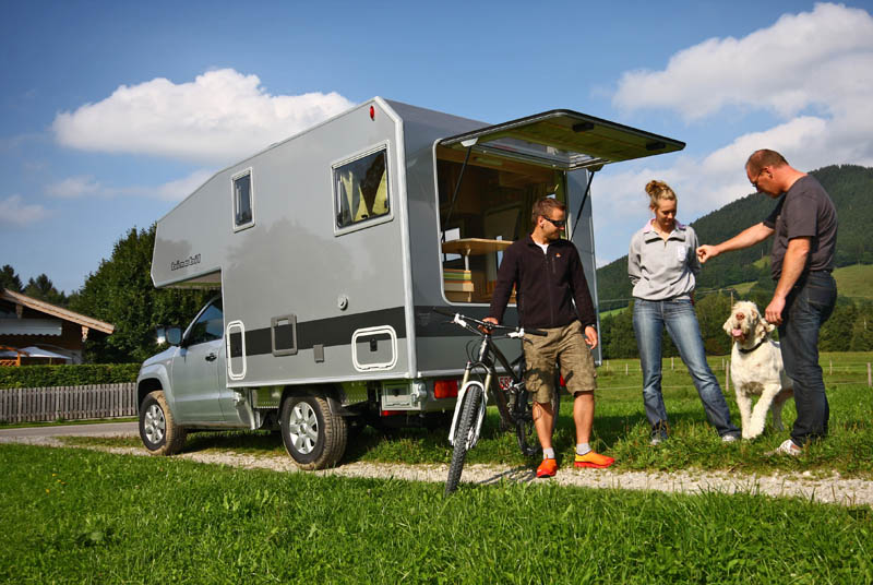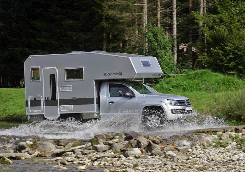 Bimobil husky 270 auf VW Amarok Single Cab - Wohnkabine für Zwei20.08.2012 Der VW Amarok wird mit der neuen bimobil Absatzkabine husky 270 zum Reisemobil für zwei bis drei Personen. Das gebotene Plus an Ladefläche des Amarok als Einzelkabiner hat bimobil in einen großzügigen, komfortablen Wohnraum umgesetzt. Das Raum-Plus zeigt sich unter anderem im geräumigen Bad (124 x 67 cm), das mit Dusche, Toilette, Keramikwaschbecken und farbenfrohen Mobiliar voll ausgestattet ist. Die gegenüber liegende Kücheneinheit mit 95-Liter-Kühlschrank, zwei großen Staufächern und dem bimobil-typischen Gewürzregal lässt ebenso wie der mannshohe Kleiderschrank keine Wünsche offen. Die neu konstruierte Hecksitzgruppe ruht auf einem Podest, das Platz schafft für die darunter liegende Truma Combi 4 und den, von innen und außen gut zugänglichen, üppigen Stauraum. Dank der zwei Außenklappen können lange Gegenstände wie Ski oder Surfbrett einfach quer durchgeladen werden. Durch einfaches Absenken der Tischplatte entsteht ein Single-Schlafplatz für die Nacht. Eine große Liegefläche hält darüber hinaus der Alkoven parat: Mit 1550 x 2050 mm kommt hier sicherlich kein Gefühl der Enge auf.