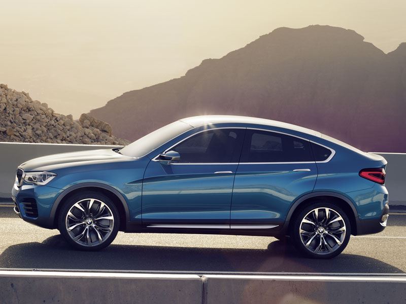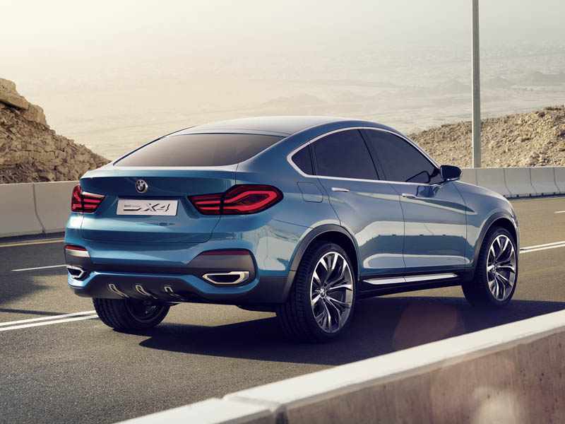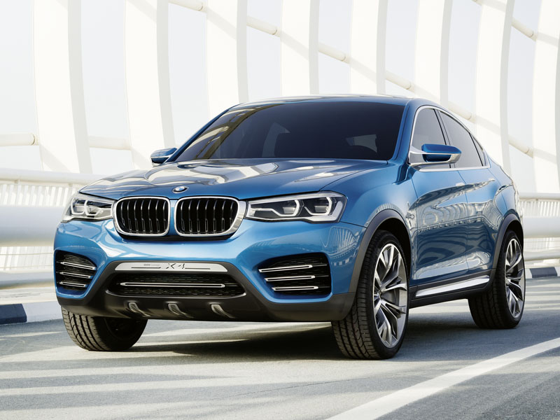Auf der Shanghai Autoshow feiert diesen Monat die seriennahe Studie des BMW X4 seine Weltpremiere. Der X4 hat eine Karosserielänge von 4.648, einer Breite von 1.915 und einer Fahrzeughöhe von 1.622 Millimetern. BMW-typisch ist neben der langen Motorhaube, den kurzen Überhängen und dem zurückversetzten Fahrgastraum auch der lange Radstand von 2.810 Millimetern. 21 Zoll große Leichtmetallräder leisten einen zusätzlichen Beitrag zum athletischen Auftritt des neuen Sports Activity Coupé. Technikkomponenten und Motoren soll sich der X4 vom SUV X3 ausleihen, preislich wird er aber – Coupé-typisch – oberhalb des SUV-Modells angesiedelt sein.
