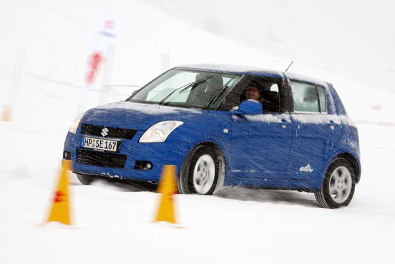Viel Schwung vor jedem Steilhang benötigt speziell der Swift mit seiner Kombination aus kleinem Motor und langer Straßenübersetzung. Doch sein Allrad überzeugt im Tiefschnee. Dank des großen Drehzahlunterschiedes zwischen der permanent angetriebenen Vorderachse und der mitgezogenen Hinterachse schließt die Viscokupplung schnell und stellt so konsequent den Kraftschluss zu den Hinterrädern her. Leicht und handlich prescht der Swift 4x4 durch jede Tiefschneestrecke - auch im Drift, wenn der Fahrer nur konsequent genug auf dem Gaspedal stehen bleibt, schließlich stört hier kein ESP das fröhliche Treiben.