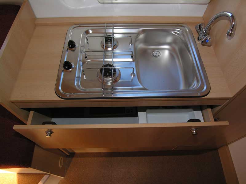 Vor der Sitzgruppe stehen auf der linken Seite das Küchenmöbel mit Zweiflammkocher-Spüle-Kombination und der Kombischrank, der unten ein Kleiderfach und darüber ein kompressorbetriebenes Kühlabteil mit 45-Liter Volumen beherbergt.