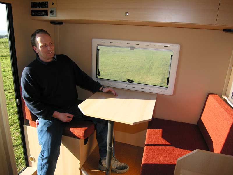 In die Kabine steigt man über eine hinter der Hinterachse angestellte Leiter. Hinten quer erstreckt sich die Sitzgruppe. In dem in Fahrtrichtung rechts platzierten Einzelsitz steckt die Boiler-Heizungs-Kombination Truma C 4002. In der linken, breiteren Sitzbank sind die zwei 11 kg-Gasflaschen untergebracht. Der an der Rückwand angeschlagene Klapptisch steht auf einem Podest, das als Stauraum zur Verfügung steht.