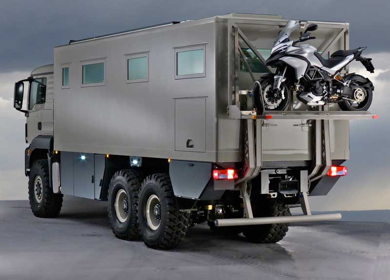 Actionmobil Global XRS 7200: Komfort für Weltenbummler - Seite 3Natürlich darf eine Multimedia-Anlage zur optischen wie akustischen Unterhaltung nicht fehlen: An der Rückwand des Waschraums „klebt“, zum Wohnbereich hin, ein großer TV-Flachbildschirm, die Beschallung übernehmen eine Lautsprecher-Unit von Bose. Waschmaschine, Dampfgarer, Media-Equipment, Beleuchtung… eine Standard-Bordelektrik würde da in die Knie gehen. Actionmobil hat eine Einheit aus leistungsfähigen, aber extrem leichten Lithium-Ionen-Batterien in der Heckgarage eingebaut, an der Wand zum Wohnraum hin ist die Steuerungsanlage für die komplette Elektrik installiert. Und dann ist da noch der quasi krönende Abschluss am Heck des Actionmobil Global XRS 7200: Hoch oben auf einer Trägerplattform, die sich hydraulisch herauf- und herunterfahren lässt, parkt Jack's Ducati Multistrada. Das große Bike braucht er, meint der Kanadier, um beispielsweise mal eben schnell zum Brötchenholen zu fahren. Ein Bäcker ist auf dem Alaska-Feuerland-Highway nicht immer um die Ecke.