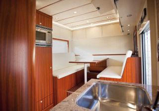 Zum luxuriösen Ambiente tragen zudem die Auspolsterung der beiden Sitzbänke mit cremefarbenem Leder sowie der mit Padukholz in Schiffsparkettoptik ausgelegte Wohnraumboden bei. Und natürlich darf eine Audio- und TV-Anlage mit einem Flachbildschirm über dem Doppelbett nicht fehlen, die ihre Programme über eine Oyster Vision Sat-Anlage mit einer 85 cm-Schüssel empfängt.