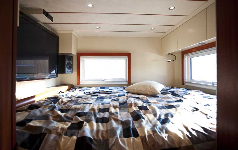 Kleidung, Geschirr, Trockenlebensmittel und das übrige Equipment lassen sich in den diversen Ober- und Unterschränken sowie einem großen Kleiderschrank verstauen. Die frischen Lebensmittel sowie Getränke nimmt ein Kühlschrank mit integriertem Gefrierabteil auf. Für die Zubereitung der Mahlzeiten sind ein Dreiflamm-Gasherd und eine Mikrowelle eingebaut, daneben ist ein großes Edelstahl-Spülbecken in die Arbeitsplatte eingelassen.