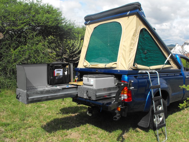 African Outback Pioneer – Klappzelt für die Ladefläche09.06.2010 Der südafrikanische Outdoor-Spezialist African Outback macht mit seiner neuen Ladeflächen-Abdeckung, die mit wenigen Handgriffen zum Dachzelt wird, den Toyota Hilux Einzelkabiner zum Mini-Wohnmobil. Man nehme dazu einen Small-Size-Pickup mit Einzelkabine – wie eben den Toyota Hilux – verpasse ihm die neue Laderaumabdeckung von African Outback mit integriertem Dachzelt sowie einiges an zusätzlichem Outdoor-Equipment und schon steht einem Camping-Wochenende im afrikanischen Outback nichts mehr im Wege. Das Herzstück des „Pioneer“-Aufbaus ist seine Laderaumabdeckung, die sich in Sekundenschnelle zum Mini-Camperf aufklappen lässt. Unter dem Alu-Dach entsteht so eine 2,30 Meter lange und 160 cm Breite Liegefläche mit 80 mm dicker Matratze. Unter dem Bettenbau ist ein zwei Meter langes Schubladensystem montiert, das die Campingküche aufnimmt – inkusive Kühlbox, Zweitbatterie, Gasflasche und Feuerlöscher. Stauraum für Kleidung und Co steht im hinteren Bereich des Schubladensystems zur Verfügung und ist bei aufgeklapptem Zelt zugänglich. Ein 60-Liter-Wassertank und ein Sonnensegel runden die Ausstattung des 285 Kilo schweren und binnen 20 Minuten demontierbaren Pioneer-Paketes ab, auf dessen Oberseite per Trägersystem zusätzlich noch Freizeitausrüstung wie Montainbikes oder Kanus montiert werden kann.
