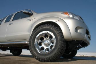Beadlock-Felgen von delta 4x4 – Coole Schlappen für den Hilux11.02.2009 Delta 4x4 stellt den Toyota Hilux auf 18-Zoll-Räder und verpasst dem Pickup eine Höherlegung sowie Kotflügel-Verbreiterungen. Eine der auffälligsten Alufelgen für einen Geländewagen ist sicher die „Beadlock“ von Mickey Thompson, deren Design aus der amerikanischen Offroad-Racing-Szene stammt. Ihre Besonderheit: Mittels eines „Lock-Rings“ wird der Reifen auf der Felge festgeklemmt. Dieser verhindert, dass sich der Reifen bei zu hoher Belastung (und wenig Luftdruck) auf der Felge dreht. Mickey Thompson hat diese Optik für seine Felgenlinie übernommen. Bei der Beadlock dient der Ring jedoch in erster Linie als Anfahrschutz, der bei einer Beschädigung leicht ausgetauscht werden kann. Die Ringe gibt es wahlweise in schwarz, rot, gold, blau und poliert. Bei delta4x4 kostet ein Komplettradsatz Beadlock in 10x18 Zoll für den Toyota Hilux 3.950 Euro, inklusive Mickey Thompson Reifen in der Dimension 305/60-18.